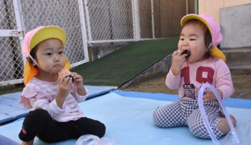 0歳児のみんなも、園外保育の雰囲気を味わい、テラスで食べてみました✧